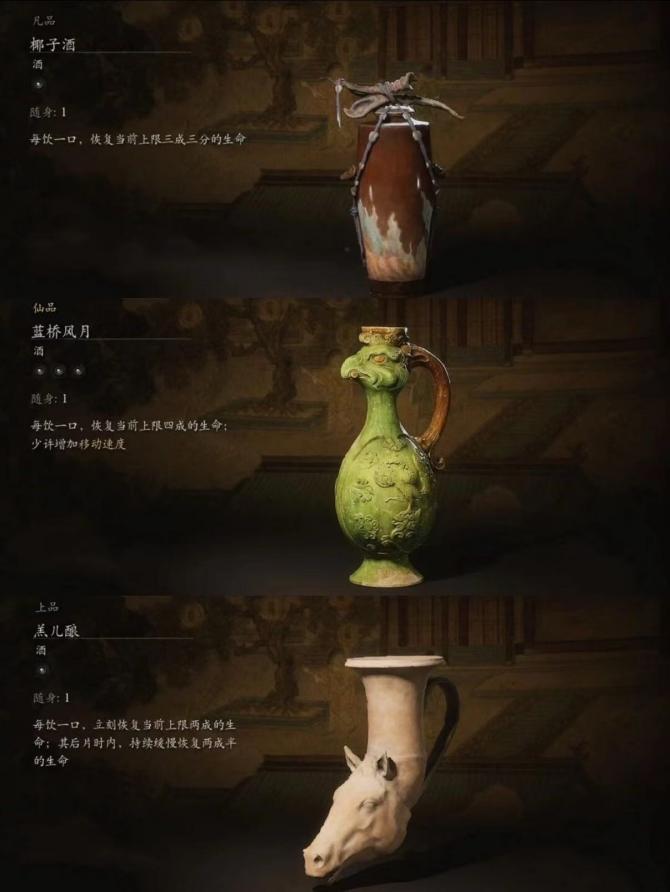 酒:这可是重要的恢复道具,饮用葫芦中的酒可以回复生命值,但有使用次数限制。可以在土地庙调息或击败大妖吸收精魄恢复次数。