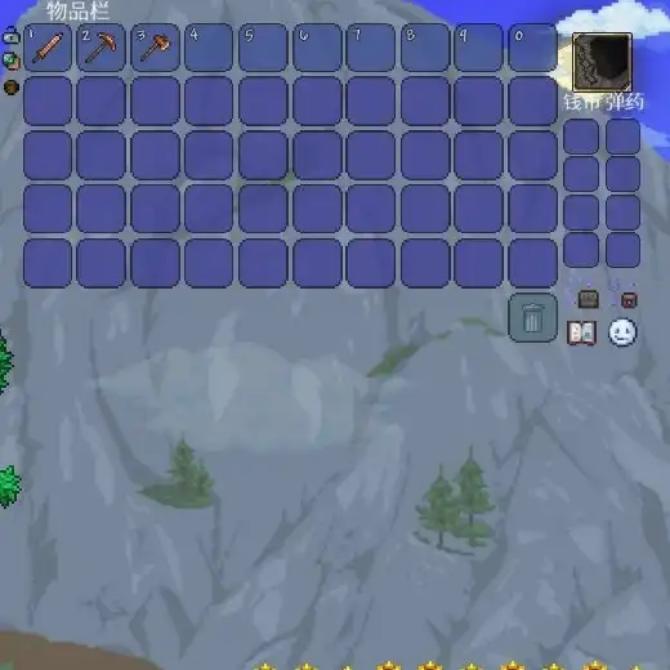 一进游戏,就能看到左上角的快捷栏有三件装备,分别是剑(打怪),稿子(挖东西),斧子(只能砍树,注意我说的是只能砍树),ESC键打开背包,可以看到自己捡到的东西都在这,第一栏叫快捷栏,把常用的东西放在这,鼠标滚轮能快速选取快捷栏的道具,选取时变黄的格子是