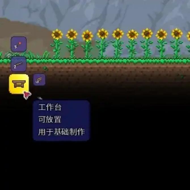 开局先砍树做工作台,砍树拿斧子砍树的根部,鼠标指向哪里,就能砍哪里,造建筑也同理,拿着方块点哪里就能放在哪里(但注意不能离自己太远),挖矿也是这样,键盘左下角Ctrl键可以开启智能光标,开启后会有黄色的光标使得工具优先破坏最近的目标(后面要考),做好工作台后,拿着点一下地面放下来,只要你靠近工作台就相当于使用了,会多很多制作配方(后面的熔炉铁砧同理)
