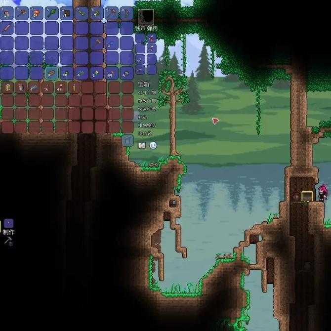 遇见宝箱了可以右键打开,然后在宝箱空间的右边有抢夺全部,可以全部拿走,然后把箱子挖了。推荐去找沙漠然后挖仙人掌做仙人掌剑(伤害高,范围大),做仙人掌套装
