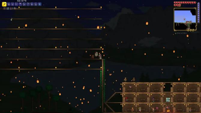 回去后在高墙上造台阶远程给僵尸洗头,没远程就造弓,然后造点火焰箭或者星星箭,放在弹药栏第一个会优先使用,我是专家模式,所以爆率高一点,掉了个强力武器,如果僵尸在敲你的门,你可以拿个方块堵住门,他就进不来了。晚上就小小扩建一下房子然后打打怪,再捡点星星做如图蓝色的星星,使用后可永久增加最大魔力值,对以后有帮助,等到白天后去捡掉地上的钱,然后房子还有空余的话商人会入住,在家里放个箱子,把用不到的东西先存一下