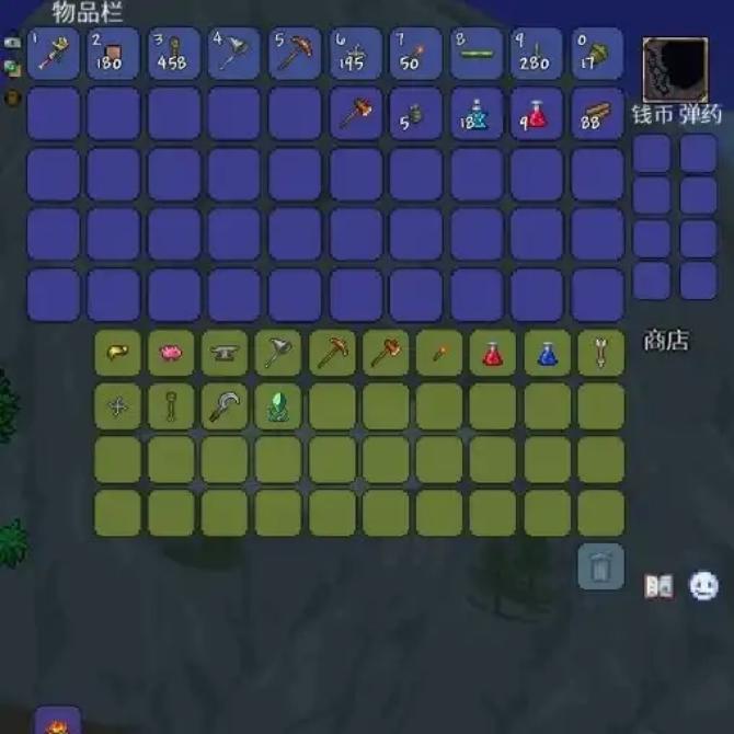 右上角红色的是血量,蓝色的星星是魔力值(用魔法武器会消耗),下面就是地图,再下面就是装备栏,绿色一栏从上到下依次是头盔,胸甲,腿甲,饰品x5,左边一栏是装扮,穿装备能改变外观,但不会提供任何功能以及属性,再左边是染色的,下面的白色盾是防御值
