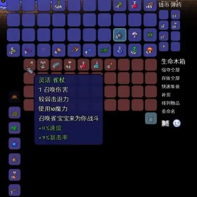 箱子里能开出各种东西,药水还有装备,鼠标停留在物品上能查看介绍,前期拿的吹管比较有用,带在包里后打草能掉草种子作为弹药,便宜实惠,打怪还不错的远程,如果快晚上了就喝回城药水,没有的话就看能不能跑回去,司了也没事