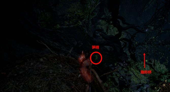 这条小岔路上有一个笋精。玩家看到笋精大都直接追了上去,很容易就忽视了旁边其实还有一座隐形桥。