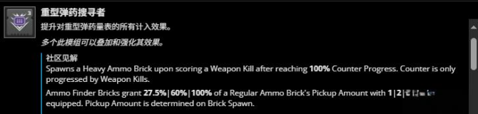 棒鸡为这个模组做了递增式增益效果,其实际效率是很可观的,因此缺弹药时一定要保证至少一个越多越好的搜寻模组,而值得一提的是,社区见解告诉我们“偃月近战”实际上被视为白弹击杀,因此在极度需要双绿的环境可以带一把偃月来产子弹(注意!偃月近战击杀不会同步武器属性中的“弹药搜寻进度”属性,因此需要普通白弹约两倍的击杀量,所以如果真的很缺子弹适当考虑白弹)