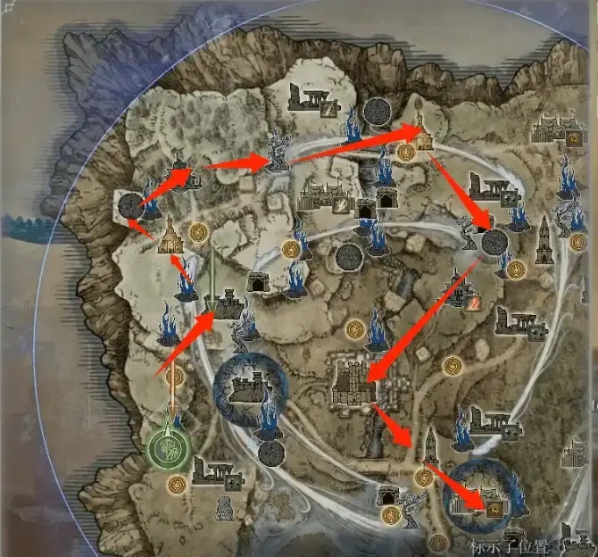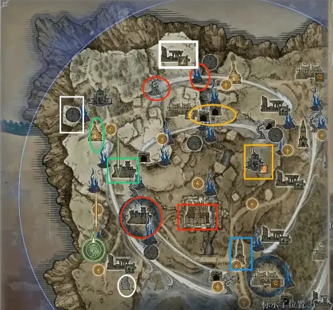 先搞懂地图上的“暗号”:黑点是监牢,白框是废墟,绿框是要塞,绿椭圆圈的是圣杯瓶,暗绿圈的是随机的黑夜入侵,黄框是教会,黄椭圆是矿洞,还有白色椭圆标的恶魔商人。