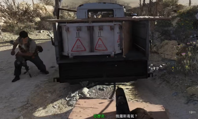 毒气生存:跟随哈尔撤离至地堡,拿取防毒面具。
