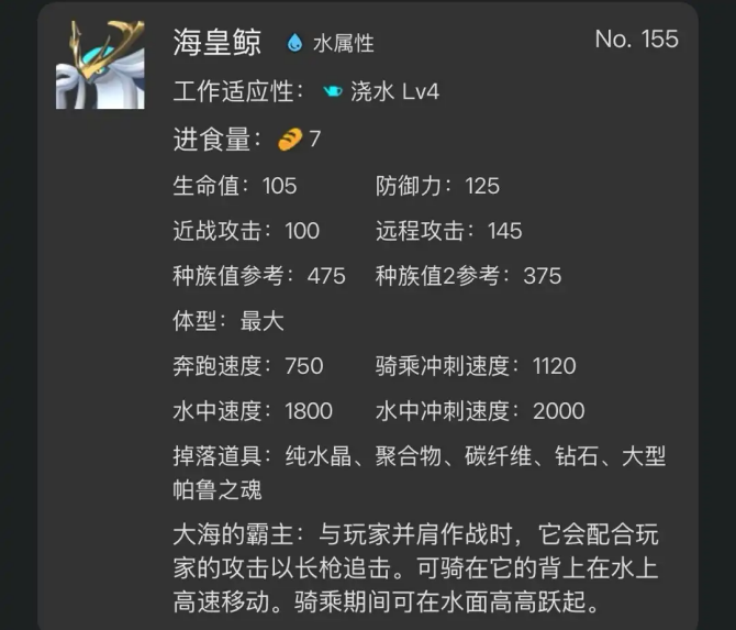 中期换覆海龙(39级解锁),水中1080、冲刺1800,不耗耐力还能升星加移速,比前期坐骑稳多了。后期直接上海皇鲸(63级解锁),水中1800、冲刺2000,星级加成拉满,移动时还能高高跃起,水上王者实锤!