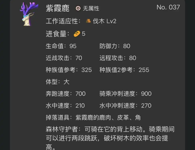 要是喜欢跳着走,12级解锁的紫霞鹿也成,虽然速度比猎狼慢点(奔跑700、冲刺900),但能二段跳,星级加伐木,看个人喜好选。