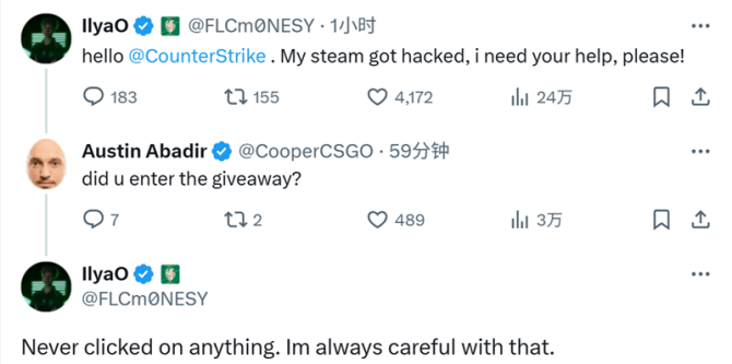7月20日,Falcons战队狙击手m0NESY在社交平台求助CS官方,称自己Steam账号被盗。