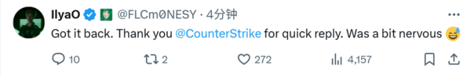 所幸CS工作人员收到m0NESY的反馈后,反应迅速,问题很快得到解决。他也公开向CS的工作人员表示感谢。