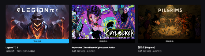 一款是《军团战争 TD2》,7月31日晚11点前免费领取。另外两款是《钥匙柜》和《朝圣者》,7月31日至8月7日间免费领取。