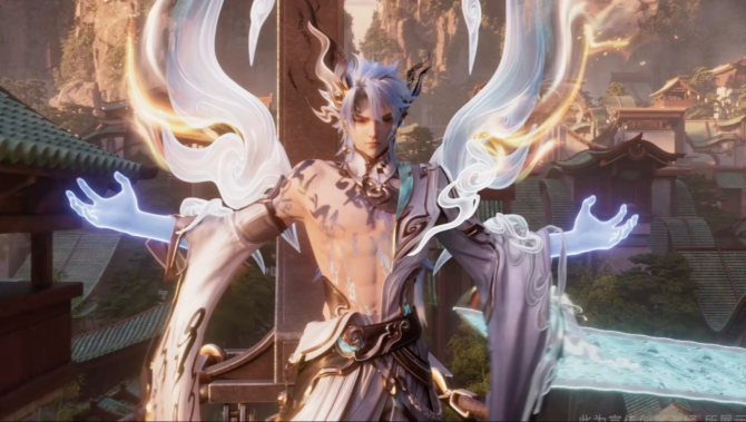 造型设计:神兽范儿拉满。头生玄角配渐变蓝挑染白发,墨韵流金超有质感;博带广袖加云纹金饰,雅痞中透着贵气。最绝的是背后灵羽,展开瞬间气场两米八,白泽真身一现,直接帅到失语!