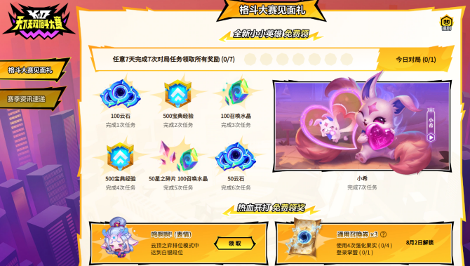 十重福利:白嫖党狂喜。完成对局任务就能领全新小小英雄“小希”,还有云石、召唤水晶、星之碎片等硬通货,连表情和通用召唤券都安排上了。这波免费福利纯纯送分,不领血亏!