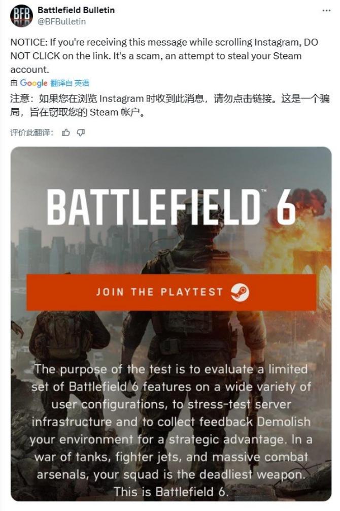 这些伪造的邀请帖与EA官方发布的风格非常相似,包括《战地6》的主画面,以及“加入测试”和Steam标志,大大提高了游戏的可信度。