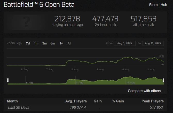 《战地6》的在线人数又刷新高了,公测当天一度超过25万,现在更是在线峰值过了52万,成为Steam有史以来同时在线人数排名第18的游戏。而《COD》即《使命召唤》系列在Steam的最高纪录为49.17万人,这下妥妥的超越了。