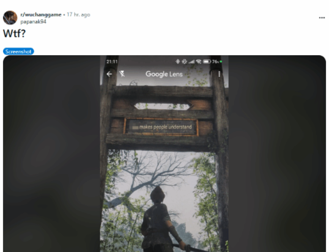 Google Lens:Reddit玩家“papanak94”用它翻译游戏里的“明心见性”牌匾,居然翻成了“人类的繁衍行为使人们相互理解”。这波操作给玩家整懵了,有人推测是机翻搞错了读写顺序,从右往左翻才闹了笑话,简直离谱到家!