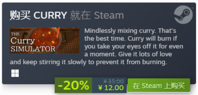 Curry Lab出品的《咖喱搅拌模拟器》已经上市了,国区售价12块钱。感兴趣的小伙伴现在就可以上线Steam购买了。