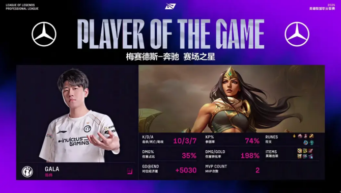 30分钟Rookie瑞兹闪现逼出飞机双招,Gala卡莎大招进场豪取三杀,IG保持阵形打团灭,顺势推家锁定胜局,Gala再拿MVP,直接把“Carry全场”焊在身上!