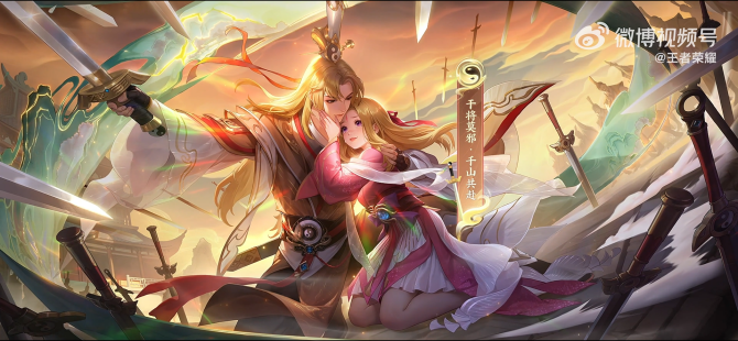 联动皮肤:干将化身王权富贵,莫邪化身清瞳,双人皮肤绝美。皮肤为传说限定品质。首周礼包价990点券(含皮肤+个性按键)。售卖时间从8月28日到9月3日,9月4日-10月28日皮肤会单独上架。特效融合了王权剑、苦情树等元素,双剑分为金色和粉色,象征二人合力。回城特效和随机行走还有双人的彩蛋哦。