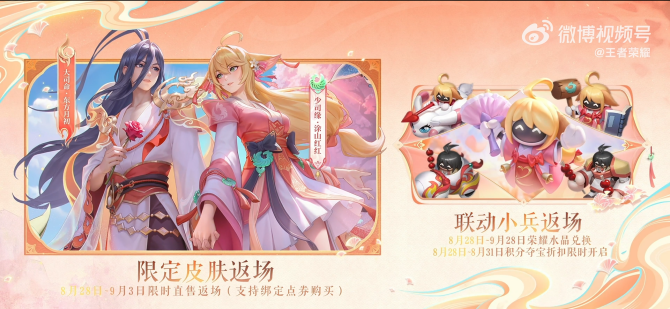 返场:这次联动少司缘&大司命的皮肤也将返场。返场皮肤为少司缘-涂山红红(史诗限定)和大司命-东方月初(史诗限定)。返场时间为8月28日-9月3日,单款售价888点券,支持绑定点券购买。同期返场的还有联动的小兵皮肤,可以用荣耀水晶兑换。