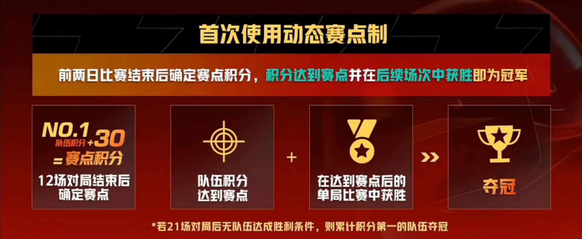 以往的赛制大家都看腻了,这次可不一样。赛前赛事方不预先确定赛点分数,而是以比赛前两天 12 场结束后积分榜第一名队伍的积分为基础,再增加 30 分来动态确定。一旦有战队在第三天比赛中达到赛点,并且在下一场单局比赛获胜,就能直接加冕冠军。要是到第三天 9 局比赛结束,都没有队伍达成条件,那就按积分排名,第一名夺冠。这种赛制,让比赛悬念拉满,每一局都可能成为决定胜负的关键局!