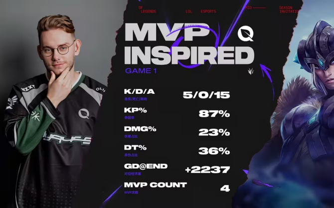 首局 FLY 节奏起飞,Inspired 猪妹各种神级开团,3 分钟配合 Bwipo 剑魔拿一血,12 分钟声东击西杀赵信控小龙,35 分钟零换四推平基地,先下一城。