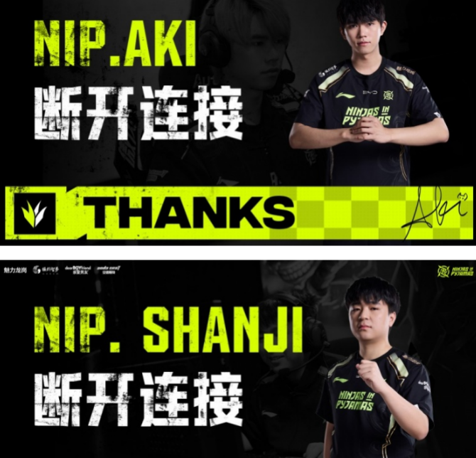 离队的三人里,shanji可是LPL曾经的最佳新人上单,不过第二赛段后半程就没见他上场了,野辅Aki和ppgod作为他的好兄弟,这次也跟着一起走了。NIP公告里还玩梗“守护忍村”,但字里行间都是遗憾,看来俱乐部对这组“保守派”已经失去耐心了。