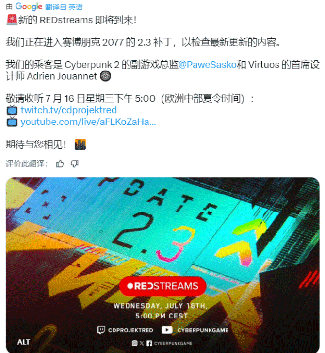 CD Projekt Red(CDPR)今天也发话了:“我们正驶入2.3更新的世界,来看看这次‘引擎盖下’藏了啥宝贝。”到时候,《赛博朋克2077》副游戏总监Paweł Sasko和Virtuos首席设计师Adrien Jouannet也会出席,亲自为大家解读更新内容,这阵容,简直让人期待值拉满!