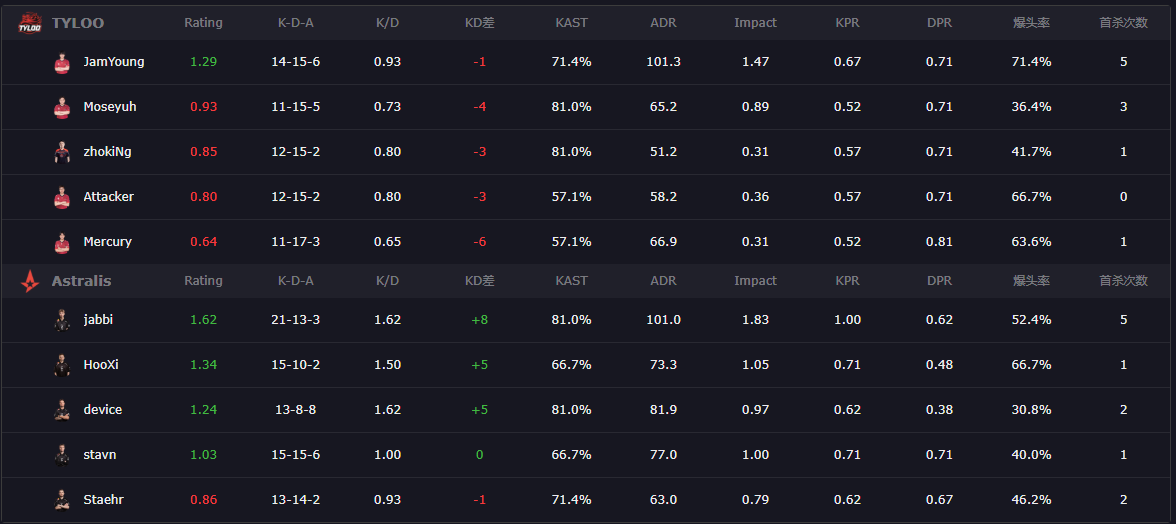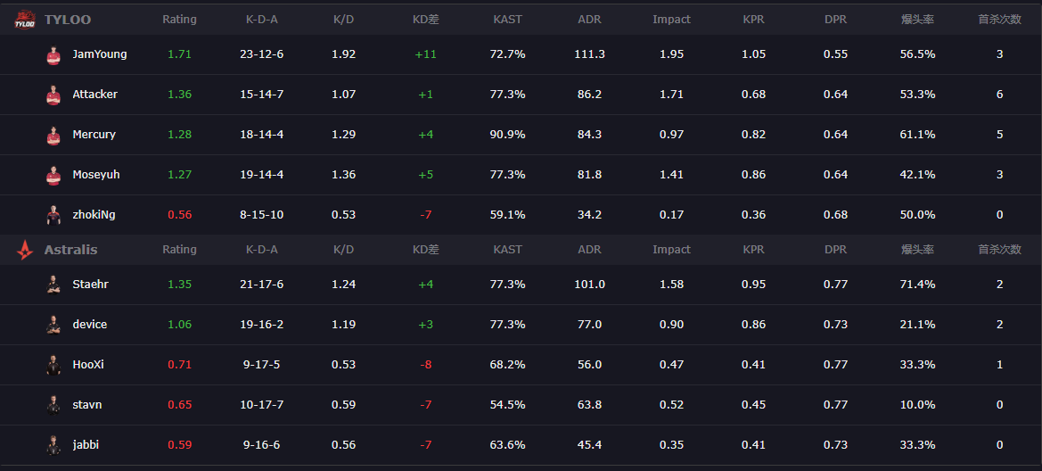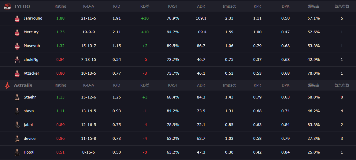 第一局:天禄攻防两端多点开花,JamYoung狂砍23杀,ADR高达111.3,Rating飙升至1.71,以13-9先拔头筹。