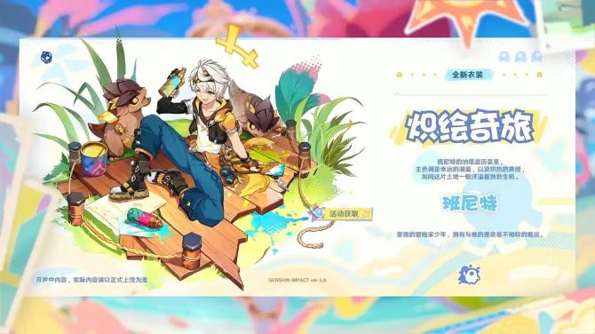 一套是班尼特的四星皮肤【炽绘奇旅】,和以往的四星皮肤一样,可以参加活动直接免费领取,等版本更新之后就可以看到实机了。