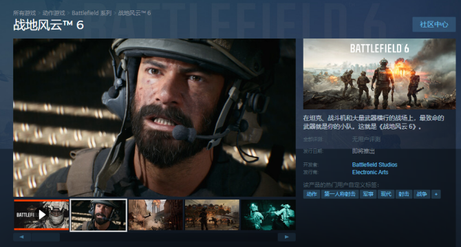 此前盛传的《战地6》现在已经公布了首支正式预告片,包含中文配音版本,此次游戏正式版也支持中文配音!游戏也已经在steam商店界面上线。