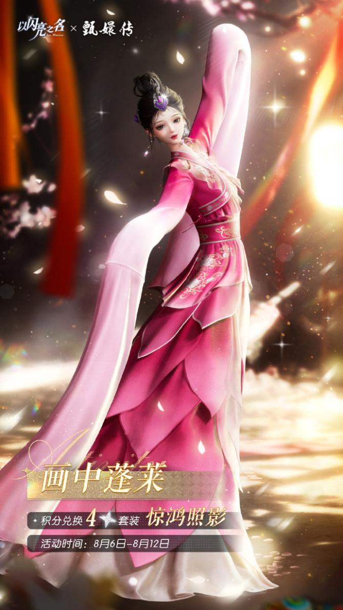 同时还有免费的惊鸿舞主题四星套装「惊鸿照影」,可以通过“画中蓬莱”活动(8月6日-13日)免费获取。