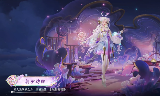 衣服材质采用了入水不濡的鲛绡轻纱制成,还配有飞花刺绣。“鲛珠”象征成长与友谊,技能释放的时候会展开梦幻水域。再加上花朵和河豚背包的配饰,更凸显了朵莉亚的少女灵动感。