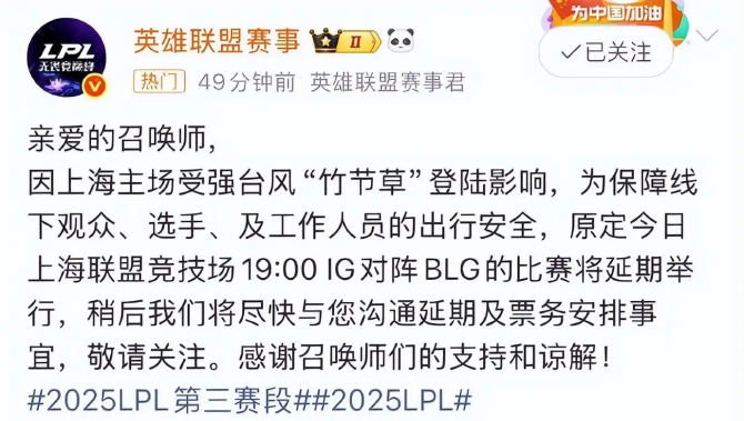 随着台风“竹节草”强势登陆,LPL第三赛段焦点战直接打乱!原定7月30日的IG对阵BLG,突然宣布延期到8月28日,这波操作让粉丝圈彻底炸开,争议直接冲上热搜!