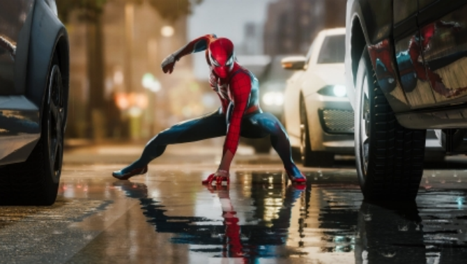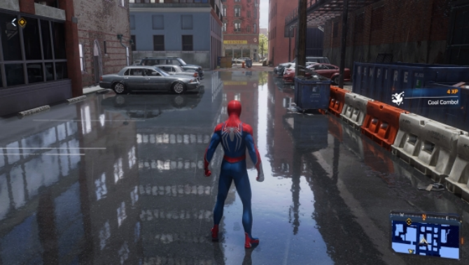 细节控狂喜:动作反射+雨天加成。飞在空中时,能看到玻璃上自己翻跟头、射蛛丝的影子;雨天更顶,湿漉漉的路面直接把街景照得清清楚楚,跑起来连影子晃动都逼真到起鸡皮疙瘩。给迈尔斯换战衣时,战衣上的反光还能跟着角度变,质感直接拉满!