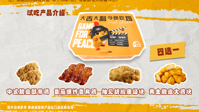 联动福利:喊黑话就白嫖。只要是《和平精英》玩家,到星轶影城线下店吼一句“大吉大利,今晚吃鸡”,再亮个游戏页面,就能领联名炸鸡体验装!中式酥骨鸡、番茄香肩鸡啥的四选一,每天每家店限10份,手慢无系列实锤了!