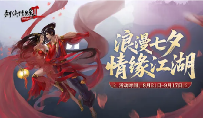 8月21日-9月17日,在游戏中,桃花岛上会出现‘星沙’矿脉,玩家可以去采集,一天最多可采集77颗‘星砂’。星沙可以换取各种浪漫的七夕节物品,比如桃花签,大侠每日可向邬远晴、冯彤儿赠送一张,重温经典情节,更有大礼包一件。同心结,是两个人互相祝福的一种方式。更有更多更高档的浪漫信物可以赢取七夕节的精美礼品。在游戏里,20个经典的约会场面都会出现在月轮上。大侠在同心锁上按一下,就可以按照坐标去拍照,然后交给月绾,就可以得到一份心意相通的礼物。