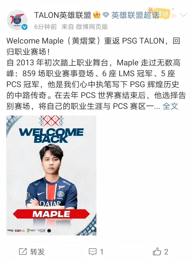 如今,相隔223天的等待与沉淀,Maple 决定重披战袍,再次以选手身份出发。这一次他将挑战生涯中第五个赛区,踏上全新舞台,迎向属于他的下一段荣耀征程!