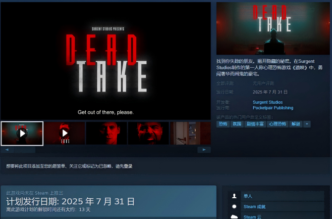独立游戏工作室Surgent Team携手发行商Pocketpair Publishing,为广大玩家带来了一款极具冲击力的第一人称心理恐怖游戏 :《遗映》(Dead Take)。这款游戏将玩家卷入一个围绕权力与腐败交织的惊悚漩涡之中,一场惊心动魄的恐怖冒险就此拉开帷幕。