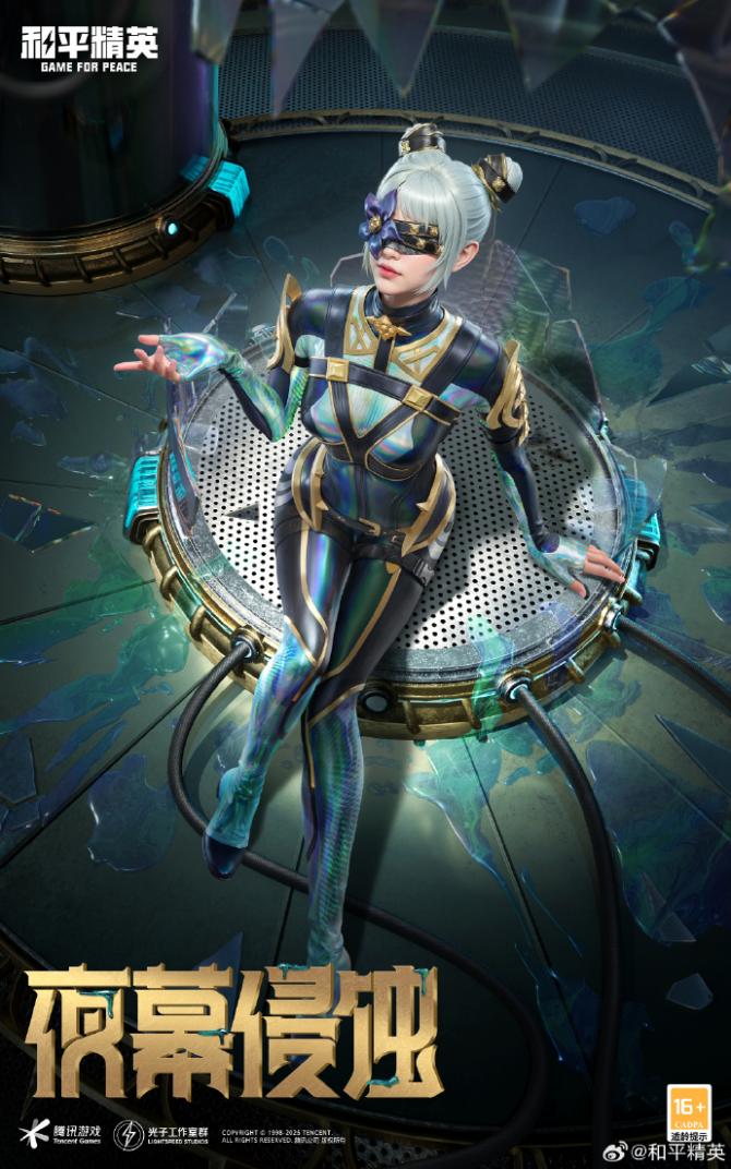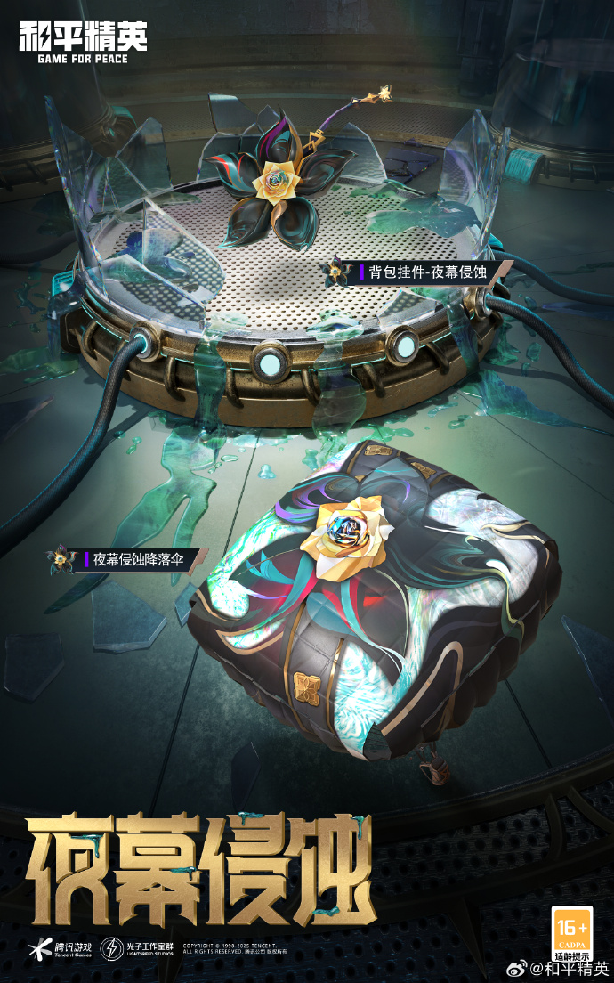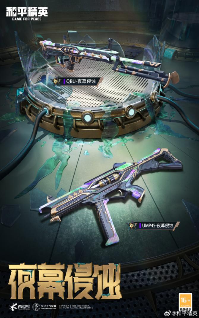 “夜幕侵蚀”主打深灰与紫红色调,角色服装采用流线型装甲设计,背部搭载可展开的荧光能量翼,战斗中触发动态光效。武器皮肤涵盖QBU、UMP45。身镶嵌晶体状发光纹路,击杀敌人时枪口会迸发紫色粒子残影。配套背包挂件与降落伞延续生物机械风格。