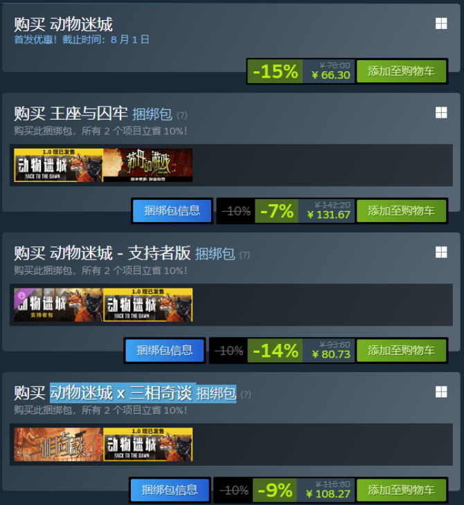首发优惠减15%,原价78元,优惠后66.3元。同时还有三个捆绑包优惠,购买王座于囚牢捆绑包,优惠7%,原价142.2元,现价131.67元,包含《动物迷城》和《苏丹的游戏》两款。购买《动物迷城》支持版棍棒包,优惠14%,原价93.6元,现价80.73元。购买《动物迷城》和《三相奇谈》捆绑包,优惠9%,原价118.8元,现价108.27元。