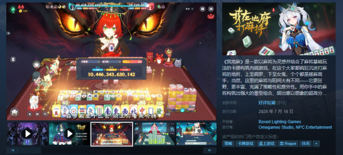 《我在地府打麻将》7月16日steam上线后不久就获得了95%以上的好评率,如今已经是“好评如潮”,这款游戏到底好玩在哪?