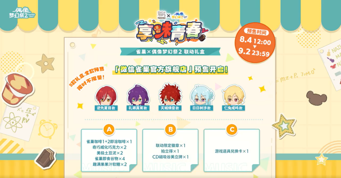 《偶像梦幻祭2》这次与雀巢中国联动咯,不仅游戏本体会更新联动玩法,同时还会有五个角色的联动礼盒进行线上的限时不限量售卖哦,8月4日正式开启,来看看具体内容吧。