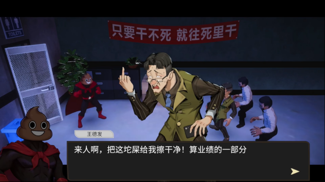 游戏讲述了牛马打工人张伟在经历重大创伤之后觉醒超能力,变身成为大便超人解救被老板PUA控制的员工、伸张正义维护世界和平的故事。听上去很俗套,但这应该是每个打工人心里隐藏的念头,现在被工作室在游戏里实现了。