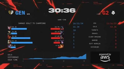 29分钟,GEN进攻G2高地,GEN拉扯出色,团灭G2,一波推平基地赢下比赛。