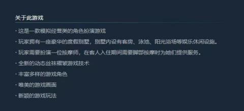 商店介绍称游戏搭载了全新的动态丝袜褶皱游戏技术。玩家需要扮演一位按摩师,接待各式各样的都市丽人,比如白领、空姐、秘书、护士,为她们按摩脚部。