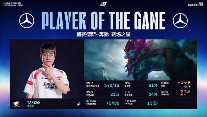 25分钟,Flandre鳄鱼单人切入后排限制三人,Shanks阿卡丽斩获三杀,AL完成零换五并击杀大龙。27分钟,Kael巴德大招定住韦鲁斯,AL五人抱团进攻,逐个击破赢下团战,随后推平基地,获得本场比赛的胜利!AL打野选手Tarzan使用巨魔拿下本局MVP!