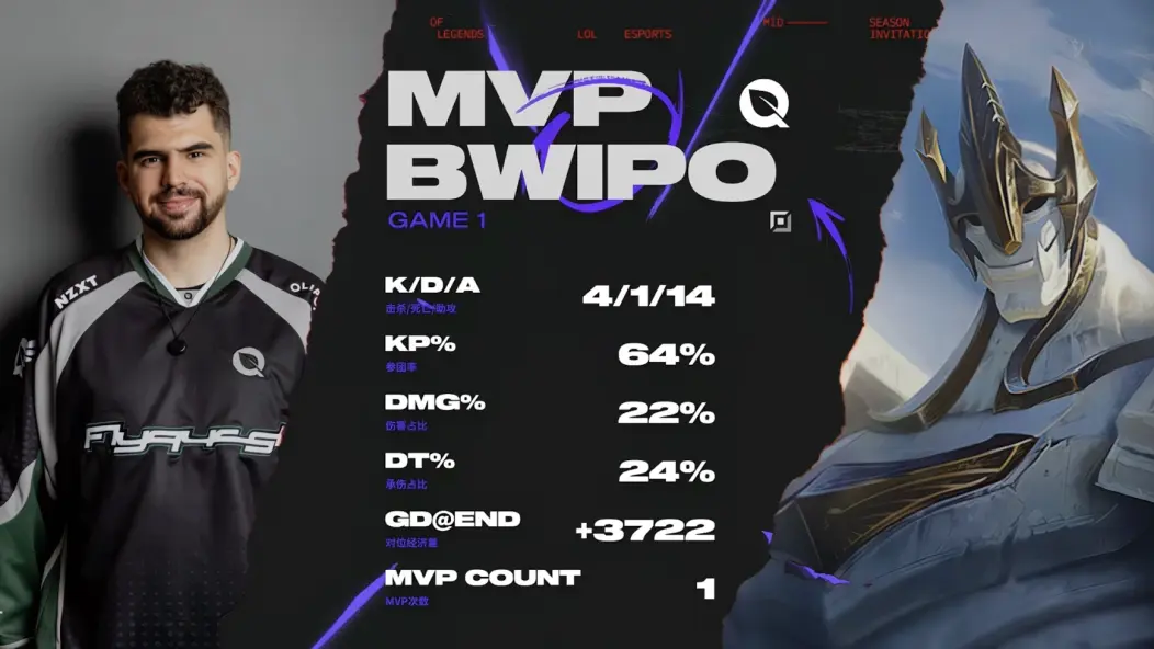首局 FLY 火力全开,前期中野联动拿下一血,中期团战更是多次打出以少换多,16 分钟时一波一换五直接拉开经济差。