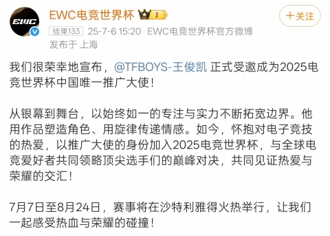 2025年7月6日,王俊凯正式官宣成为2025电竞世界杯(EWC)中国唯一推广大使。